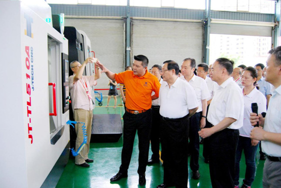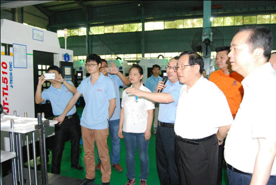 萬鋼部長考察嘉泰數(shù)控實施的“智能工廠示范工程項目”建設成果2016年6月20日,全國政協(xié)副主席、中國科協(xié)主席、國家科技部部長萬鋼和中國工程院院長周濟等來自全國各地的眾多領導專家一行,在福建省常務副省長張志南、泉州市委書記鄭新聰、市長康濤等省市區(qū)領導的陪同下,蒞臨泉州市“數(shù)控一代”匯報現(xiàn)場。在洛江區(qū)智能裝備產(chǎn)業(yè)園的匯報現(xiàn)場,嘉泰數(shù)控董事長蘇亞帥就由嘉泰數(shù)控實施的“3C產(chǎn)業(yè)數(shù)字化智能工廠示范項目”作技術講解,以及匯報自主研發(fā)的“門型五軸立式加工中心JT-GL8-V”、高速鉆攻中心JT-TL510A以及3C產(chǎn)業(yè)智能手機金屬外殼加工自動化生產(chǎn)線等最新成果。 ![]()