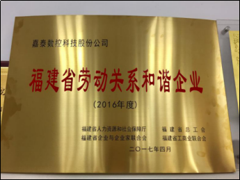 嘉泰數(shù)控:被授予“福建省勞動(dòng)關(guān)系和諧企業(yè)”榮譽(yù)稱號(hào)